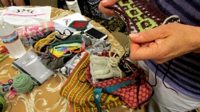 After a little rest, we enjoyed a banquet dinner (and more wine!) and Franklin Habit's presentation of his talk "B is for Purl: A Brief History of Knitting Patterns." Late night knitting ensued in the Great Room.