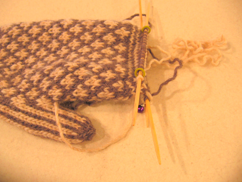 Materials: 2 skeins Lamb's Pride Worsted, one set US#4 dpns. Pattern is available for purchase in the shop.