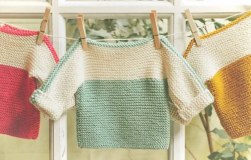 ‘These cute little French Macaroon sweaters were inspired by colorful macaroons and are knit in simple garter stitch. The sweater has a boatneck neckline, with a one button closure in the back. Each side is knit in one piece, and a three needle bind off is used to secure the shoulders to each other. Two little seams on each side finish up the sweaters. They knit up in no time, and like the delicious sweets they are named after, you might not be able to stop at just one!’