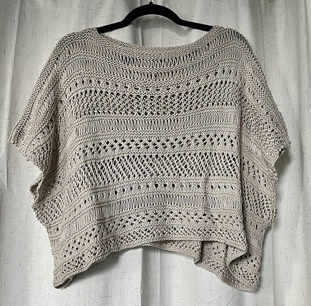 Sierra Mohr designed a modified version of E. Kate Archer’s Cancun Lace Boxy Top. She changed the original pattern so that it is knit in one piece, starting at the underarms, going up and over the shoulders, connecting front and back at the underarms, then knit in the round to the desired length. There is no seaming required. It can be knit as cropped, blouse or tunic length, in a variety of yarn weights and/or fibers, such as cotton for a summer top, or wool as a winter vest.